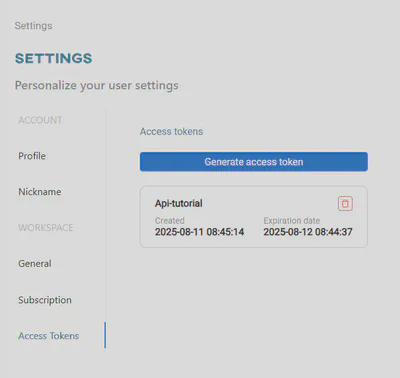To use the ONESTEP AI API, user authorization is required. This is done using an access token generated on the OSAI website in the Settings tab.